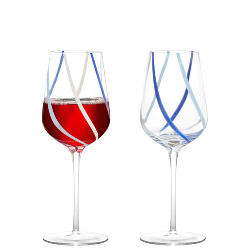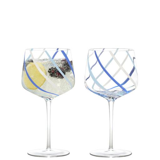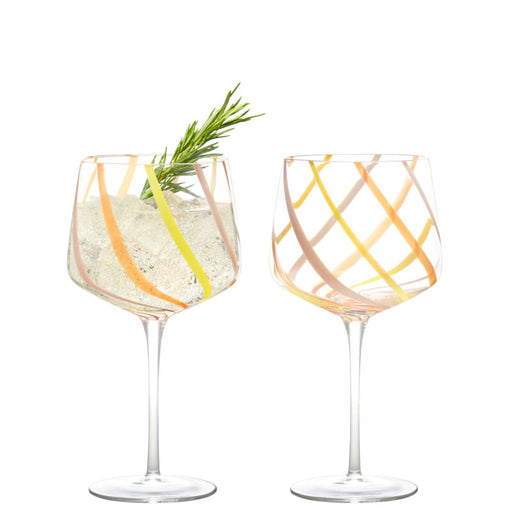 Available in two striking colourways – Azure and Citrus – each piece features bold, hand-applied colour bands that wrap diagonally around the glass, creating a sense of movement and energy. With tall, angled bowls that taper elegantly inward, the collection includes wine glasses, gin glasses, champagne coupes, and DOF tumblers.
