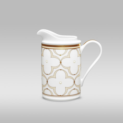 Trefolio Gold features a repeating stylized four-leaf-clover design, presented in multiple sizes on different pieces for maximum impact. The larger presentation is punctuated with raised enamel dots. The soft coloration of white and cream paired with gold makes this pattern accessible and appropriate to pair with any style of decor